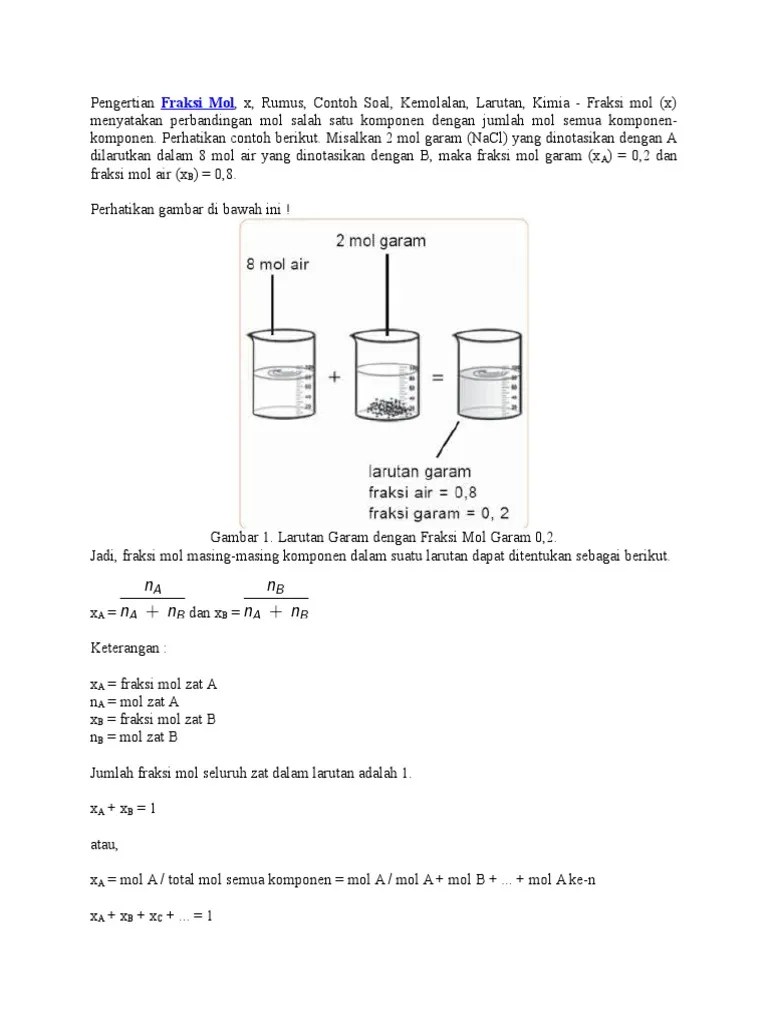 Berikut ini adalah beberapa tipe larutan dan contohnya. Ialah merupakan satuan konsentrasi yang menyatakan perbandingan antara jumlah mol salah satu komponen larutan (jumlah . Postingan ini membahas contoh soal molalitas dan fraksi mol yang disertai pembahasannya atau penyelesaiannya. Penurunan tekanan uap jenuh larutan berbanding lurus dengan …. Contoh soal dan pembahasan tentang kemolalan dan fraksi mol, menyatakan konsentrasi larutan kimia 12 sma.